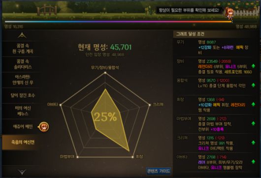 이벤트 보상을 모두 획득한 메인 캐릭터의 명성은 대략 2만 9000이다. 1만 3000을 높이려면 종말의 숭배자와 환요오괴의 주시에서 유효 장비를 획득해 세트 레어 리티를 높여야 한다.