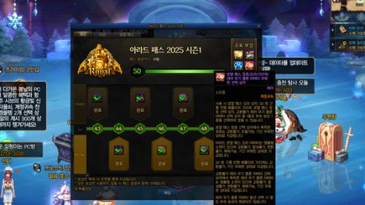 다만, 현재 판매 중인 아라드 패스 2025 시즌1은 3월 13일에 판매 종료된다. 남은 기간 안에 패스 최대 레벨 달성이 불가능하기 때문에 13일 이후 신규 아라드 패스가 출시되면 구매하자.
