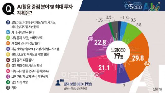 3일 한국금융신문이 창간 33주년 특집으로 19개 보험사 CEO에 한 AI(인공지능)에 대한 평가, 영향, 활용, 전망에 대한 설문조사를 진행한 결과, 보험사 CEO들은 AI 활용을 90%까지 희망하는 것으로 나타났다.
