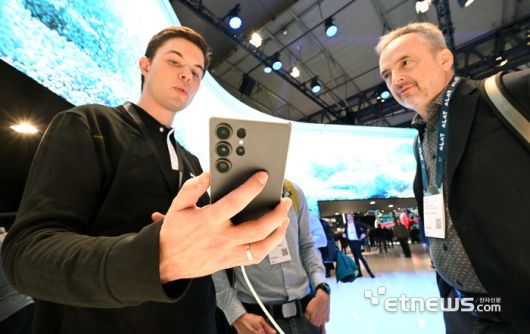 세계 최대 이동통신 박람회 MWC25(모바일 월드 콩그레스)가 '융합, 연결, 창조(Converge, Connect, Create)'를 주제로 3일(현지시간) 스페인 바르셀로나 피라 그란 비아에서 열렸다. 삼성전자 부스에서 관람객이 갤럭시 AI가 탑재된 갤럭시 S25를 체험하고 있다.