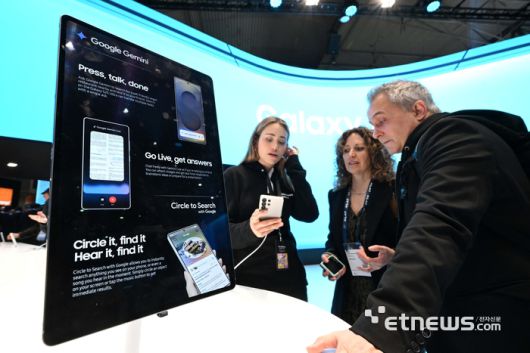 세계 최대 이동통신 박람회 MWC25(모바일 월드 콩그레스)가 '융합, 연결, 창조(Converge, Connect, Create)'를 주제로 3일(현지시간) 스페인 바르셀로나 피라 그란 비아에서 열렸다. 삼성전자 부스에서 관람객이 갤럭시 AI가 탑재된 갤럭시 S25를 체험하고 있다.