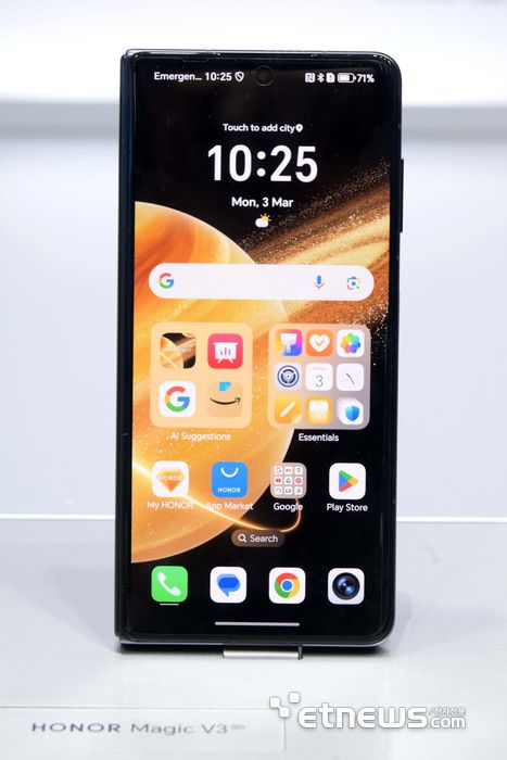 세계 최대 이동통신 박람회 MWC25(모바일 월드 콩그레스)가 '융합, 연결, 창조(Converge, Connect, Create)'를 주제로 3일(현지시간) 스페인 바르셀로나 피라 그란 비아에서 열렸다. 사진은 아너의 폴더블 스마트폰 매직V3. 바르셀로나(스페인)=김민수기자 mskim@etnews.com [Copyright © 전자신문. 무단전재-재배포금지]