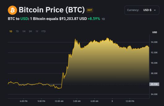 3일 세계최대 거래소 바이낸스에 따르면 오후 2시 기준 비트코인 가격은 24시간 전보다 8.5% 오른 9만2903달러에 거래되고 있다. 이더리움 가격은 24시간 전보다 10.3% 상승한 2451달러를 기록했다.