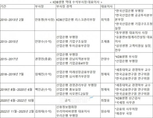 최익종 전 대표는 대우 사태 등을 담당해 '기업 구조조정 대가'라고 불리는 인물이기도 하다. 그는 LG카드 사태 당시 경영지원단장을 지내며 LG카드 경영정상화를 이끄는 등 구조조정에 일가견이 있는 인물이었다. 안동명 전 부사장은 리스크관리부장을 지내 KDB생명 리스크관리를 주로 담당했다. 당시 ING생명 출신인 구세훈 부사장, 교보생명 출신 박현수 전무 등 타 보험사 출신이 임원 자리에 있기도 했다.