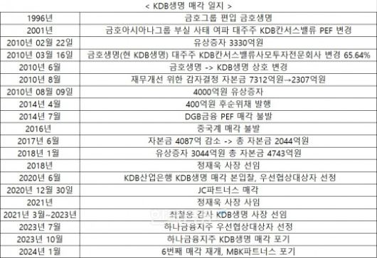 [한국금융신문 전하경 기자] 전신 금호생명이었던 KDB생명 매각 과정은 '잔혹사' 그 자체다. 금호생명에서 2010년 산업은행이 출자한 펀드로 대주주가 변경된 뒤 6차례 매각에 실패했다. 매각 실패 배경으로는 산업은행 전략 부재, 낙하산 임원이 꼽힌다. 보험을 모르는 은행 출신이 체질 개선이 필요한 KDB생명 경영 전반에 나서 오히려 망가졌다는 이야기가 나온다.