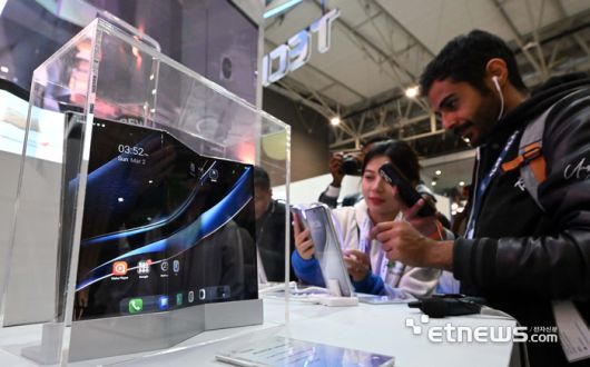 세계 최대 이동통신 박람회 MWC25(모바일 월드 콩그레스)가 '융합, 연결, 창조(Converge, Connect, Create)'를 주제로 3일(현지시간) 스페인 바르셀로나 피라 그란 비아에서 열렸다. 테크노 부스에서 관람객이 트리폴드 스마트폰 팬텀 얼티메이트2를 살펴보고 있다.