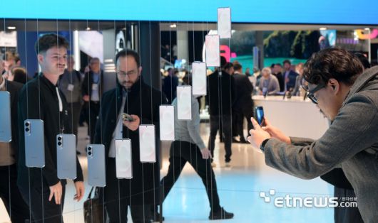 세계 최대 이동통신 박람회 MWC25(모바일 월드 콩그레스)가 '융합, 연결, 창조(Converge, Connect, Create)'를 주제로 3일(현지시간) 스페인 바르셀로나 피라 그란 비아에서 열렸다. 삼성전자 부스에서 관람객이 역대 갤럭시S 시리즈 중 가장 얇은 모델인 '갤럭시S25 엣지' 모델을 살펴보고 있다.