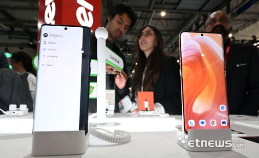세계 최대 이동통신 박람회 MWC25(모바일 월드 콩그레스)가 '융합, 연결, 창조(Converge, Connect, Create)'를 주제로 3일(현지시간) 스페인 바르셀로나 피라 그란 비아에서 열렸다. 레노버 부스에서 관람객이 모토로라의 스마트폰 레이저 50 울트라를 살펴보고 있다.
