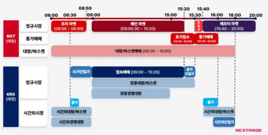 이날 넥스트레이드는 개장식을 거쳐 오전 10시부터 장을 열 예정으로 프리마켓(오전 8시~오전 8시 50분)이 없고, 메인마켓(오전 9시~오후 3시 20분)도 늦게 열린다. 이후 5일부터는 프리마켓과 메인마켓, 애프터마켓이 정상적으로 운영돼 국내 주식 거래 시간이 기존 6시간 30분에서 12시간으로 대폭 확대된다.