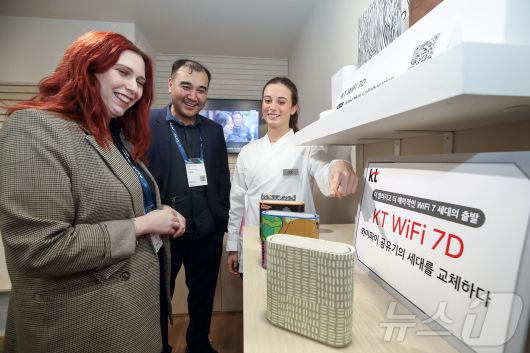 (서울=뉴스1) = KT가 국내 통신사 중 처음으로 WiFi 7 표준을 지원하는 와이파이 공유기 'KT WiFi 7D'를 출시한다고 4일 밝혔다. 기존 KT 공유기 대비 2배 이상 빨라진 최대 2.8Gbps(초당 기가비트)의 데이터 처리 속도를 제공한다는 점이 KT WiFi 7D의 가장 큰 특징이다. KT WiFi 7D는 지연이 최소화돼 AI 관련 고부하 작업도 원활히 지원한다. 스페인 바르셀로나에서 열린 '모바일 월드 콩그레스(MWC) 2025'에서 KT관계자들이 와이파이 공유기 'KT WiFi 7D‘를 소개하고 있다. (KT 제공. 재판매 및 DB 금지) 2025.3.4/뉴스1