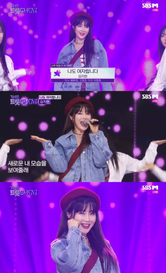 김지현은 지난 3일 방송된 SBS M '더트롯쇼'에 출연해 새 싱글 '나도 여자랍니다' 무대를 선보였다.