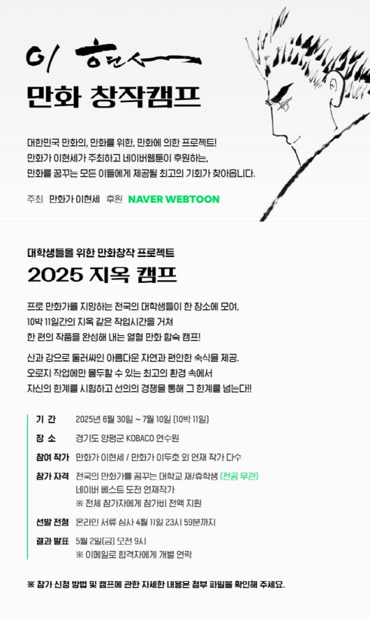 [스포츠조선 고재완 기자] 네이버웹툰이 올해도 '이현세 만화 창작캠프(이하 창작캠프)'를 공식 후원하며 아마추어 웹툰 작가 지원을 지속한다.