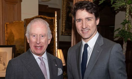 3일(현지시간) 영국을 방문 중인 쥐스탱 트뤼도 캐나다 총리(오른쪽)가 찰스 3세 영국 국왕을 알현한 뒤 기념촬영을 하고 있다. 찰스 3세는 영국의 국왕인 동시에 캐나다의 국왕이기도 하다. AP연합뉴스 |