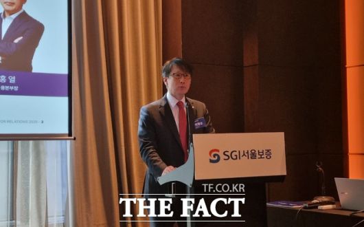 이명순 서울보증보험 대표이사가 19일 서울 여의도 콘레드호텔 서울에서 서울보증보험에 대해 설명하고 있다. /이한림 기자 |