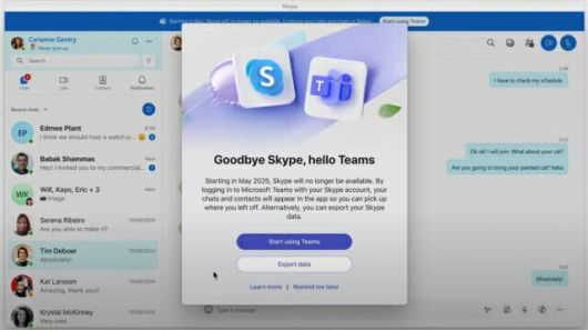 MS는 무료 소비자용 커뮤니케이션 서비스를 간소화하기 위해 스카이프를 종료하고, 2017년 출시한 ‘팀즈(Teams)’로 역량을 집중할 계획이다. 기존 스카이프 사용자는 보유한 크레딧을 팀즈에서 사용할 수 있으며, 연락처 및 채팅 기록도 자동 이전된다.