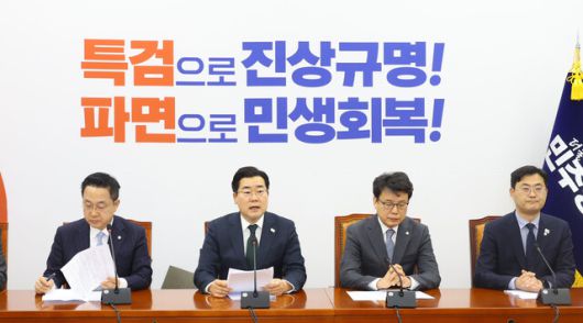 박찬대 더불어민주당 원내대표가 4일 오전 국회에서 열린 원내대책회의에서 발언하고 있다. 왼쪽부터 박성준 원내수석부대표, 박 원내대표, 진성준 정책위의장, 이정문 정책위 수석부의장. 윤운식 선임기자 yws@hani.co.kr |