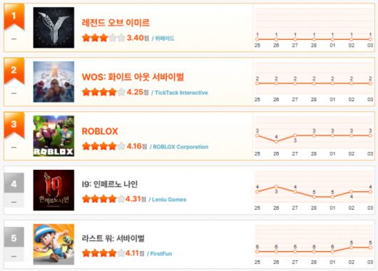 2위부터 4위까지는 'WOS: 화이트 아웃 서바이벌', '로블록스', 'I9: 인페르노 나인'이 지난주와 변동없이 순위를 유지했다.