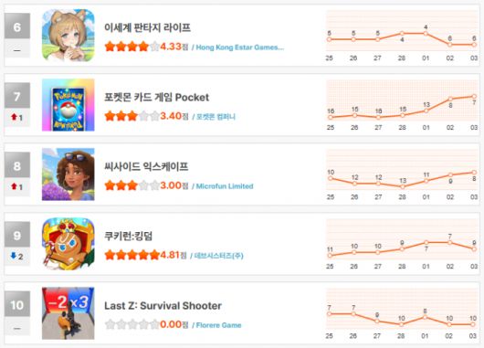 시간 때우기 머지 게임으로 주목받고 있는 '씨사이드 익스케이프'는 10위권 밖으로 밀려났다가 8위로 다시 복귀했다. 4주년을 맞은 '쿠키런: 킹덤'은 업데이트의 힘으로 9위에 랭크됐다.