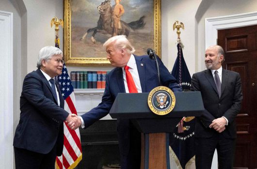 TSMC, 1000억달러 선물 도널드 트럼프 미국 대통령이 3일(현지시간) 워싱턴DC 백악관 루스벨트룸에서 하워드 러트닉 미국 상무부 장관(오른쪽)이 참석한 가운데 대만 반도체 기업 TSMC의 웨이저자 회장(왼쪽)과 악수하고 있다. 웨이 회장은 이날 기자회견을 통해 미국 내 반도체 공장에 1000억달러를 투자하겠다고 밝혔다. 로이터연합뉴스 |