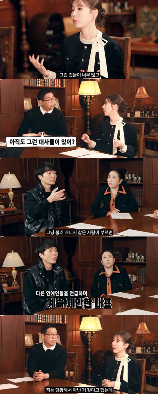 장혜리 역시 동의했다. 그는 "저도 그런 자리에 가 본 적이 있다"며 "가서 노래도 하고 그랬다. 아직까지도 힘든 부분인게 술 마시며 일 이야기하자고 하거나 이렇게 인맥을 키워야 한다고 하더라. 그런 제안이 너무 많다"고 토로했다.