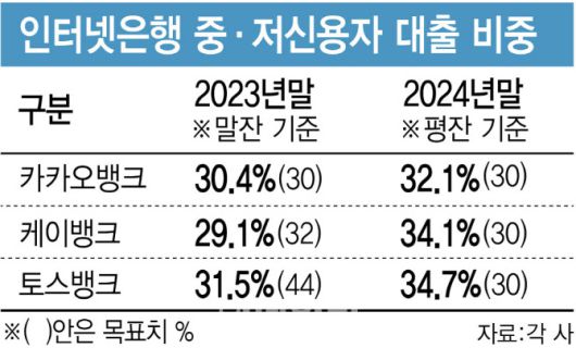 중·저신용자 대출 비중은 인터넷은행의 건전성 관리를 어렵게 하는 주요 요인으로 지목되고 있다. 중·저신용자 연체율은 2020년 1.44%에서 2023년 2.51%로 급등했다. 이런 탓에 지난 2023년 금융당국은 중·저신용자 대출을 일부 완화했다. 당시 금융위원회는 중·저신용자 대출 기준 ‘말잔’에서 ‘평잔’으로 전환하고, 각 사별로 제출했던 비중 목표도 30%로 통일했다.