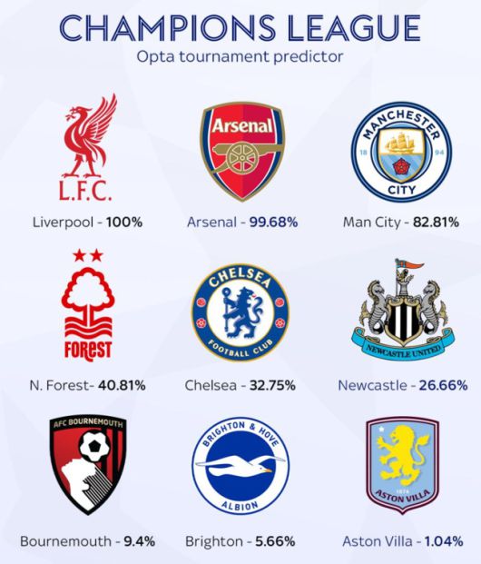 영국 '스카이 스포츠'는 4일(한국시간) 축구 통계 매체 '옵타'를 인용하여 이번 시즌 프리미어리그에서 UCL 진출이 가능한 팀들의 진출 확률을 공개했다. 리그 우승이 확정적인 리버풀은 100%, 그 밑을 쫓고 있는 아스널은 99.7%였다. 맨체스터 시티가 UCL에 진출할 확률도 82.8%로 사실상 확정적이었다.