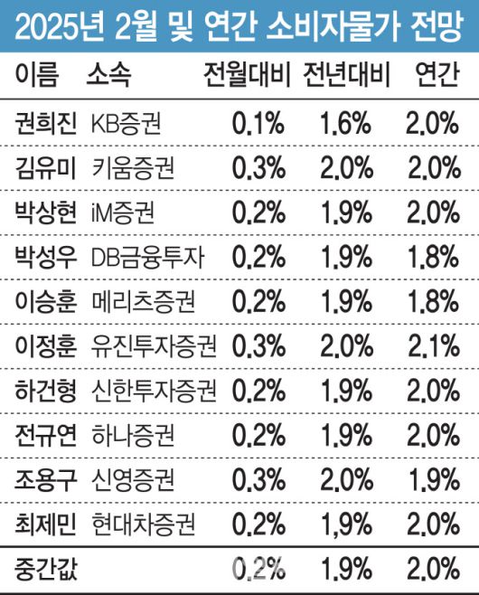 3일 이데일리가 통계청의 ‘2025년 2월 소비자물가동향’ 발표에 앞서 국내 증권사 10곳을 대상으로 설문조사한 결과 지난달 물가는 전년 동월 대비 1.9%(중간값) 오를 것으로 전망됐다. 전월 대비로는 0.2% 상승했을 것으로 예상됐다.