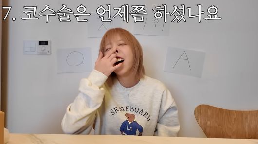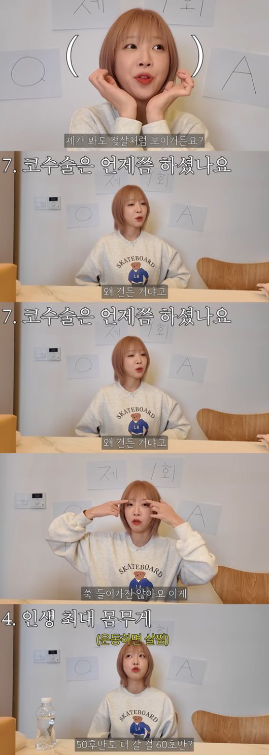 쯔양은 "코 수술은 언제쯤 했나"라는 질문에 코를 들어 올리며 성형수술을 하지 않음을 설명했다.