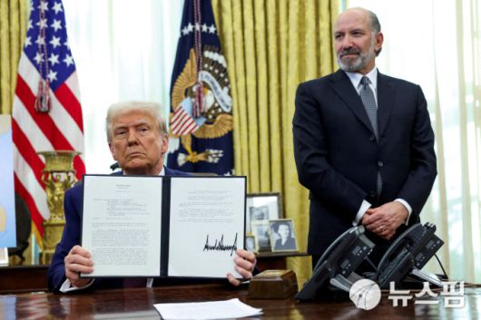 지난 13일(현지시간) 백악관 집무실에서 행정명령을 들고 있는 도널드 트럼프 미국 대통령(좌)과 그의 옆에 서있는 하워드 러트닉 미국 상무부 장관의 모습. [사진=로이터 뉴스핌] |