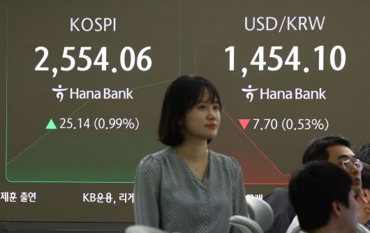 5일 오전 서울 중구 하나은행 본점 딜링룸 현황판에 코스피 지수 등이 표시되고 있다. 이날 코스피 지수는 전 거래일 대비 19.53포인트(0.77%) 오른 2,548.45에, 코스닥은 5.45포인트(0.74%) 오른 743.35에 개장했다. /연합뉴스 |
