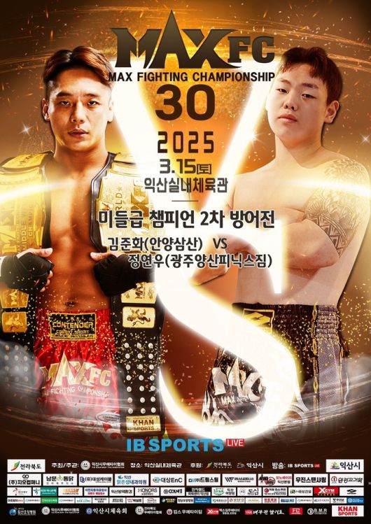 오는 15일 전북 익산시 익산실내체육관에서 ‘MAXFC 30 IN 익산’이 열린다. 메인이벤트는 미들급 챔피언 김준화(37/안양삼산)의 2차 방어전이다. 상대는 신예 정연우(21/광주양산피닉스짐)다.