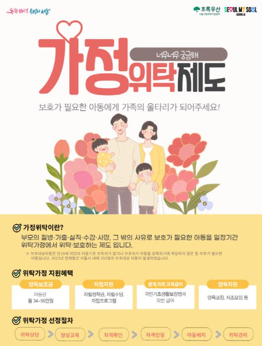 시는 가정위탁아동의 안정적인 성장과 자립을 돕고 위탁가정의 양육부담 완화를 위해 올해 △양육보조금 인상 △아동용품구입비 지원 확대 △서울엄마아빠택시 지원대상 포함 등 지원책을 강화한다. 이를 위해 올해 가정위탁아동 지원에 총 61억 5300만원을 투입한다.