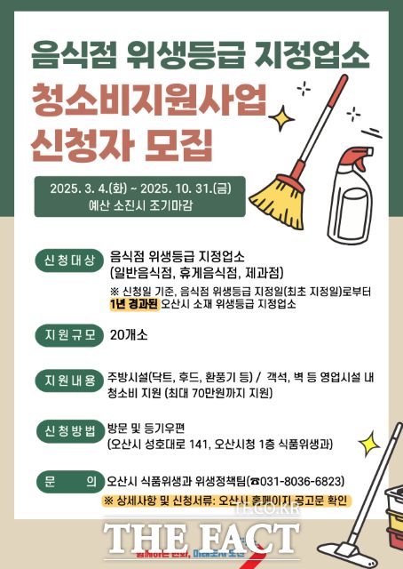 [더팩트ㅣ오산=신태호 기자] 경기 오산시는 음식점 위생등급 지정업소 20개소에 최대 70만원의 청소비를 지원한다고 5일 밝혔다.