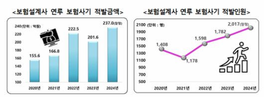 보험사기가 갈수록 정교해지면서 보험설계사가 가담한 사기도 증가하고 있는 것으로 나타났다. 5일 금융감독원 통계를 보면 보험설계사가 연루된 보험사기 적발액은 2020년 155억6000만원에서 지난해 237억원으로 늘었다. 같은 기간 보험사기 적발인원도 1408명에서 2017명으로 증가했다.
