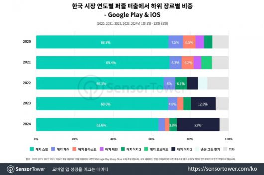 센서타워의 데이터에 따르면, 매치류 게임이 모바일 퍼즐 매출의 대부분을 차지하고 있으며, 그중에서도 《꿈의 정원》과 《로얄 매치》 등으로 대표되는 매치 스왑 장르는 오랜 기간 1위를 유지해왔다. 하지만, 최근 주목할 만한 변화는 매치 머지 2 장르의 급부상이다. 2020년 당시, 이 장르는 퍼즐 게임 매출의 0.5%를 차지하며 하위 장르 중 11위에 불과했지만, 2024년에는 점유율이 22%까지 상승하며 한국 퍼즐 게임 시장에서 두 번째로 큰 하위 장르로 자리 잡은 것으로 나타났다.