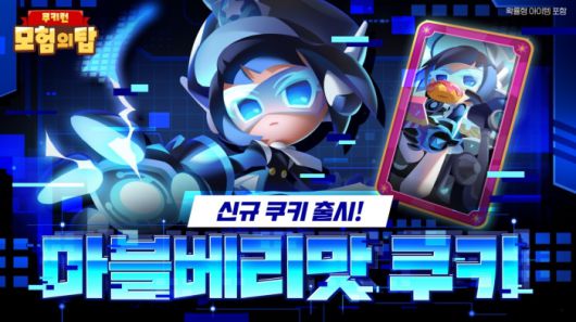 어둠 속성의 에픽 등급 스트라이커 ‘마블베리맛 쿠키’가 공개됐다. 쿠키들의 가상 현실 게임인 타워 아레나의 시스템을 보호하는 신입 백신 요원으로, 빈틈없는 사격 실력과 냉철한 판단력을 갖춘 정예 쿠키다.