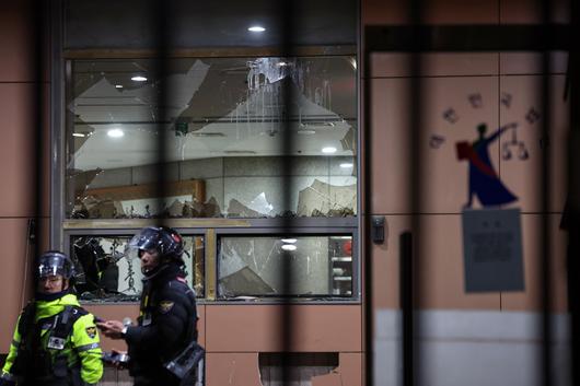 지난달 19일 새벽 서울 마포구 서울 서부지방법원에 윤석열 대통령 지지자들이 난입해 유리창과 법원 건물 벽면 등을 파손한 흔적이 남아 있다. /뉴스1 |