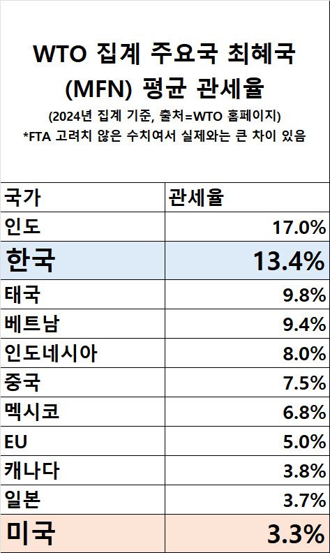 실제와는 큰 차이가 있다. MFN 관세율은 양자·다자 자유무역협정(FTA)을 고려치 않은 것이기 때문이다. 한국은 22건의 FTA를 통해 59개국과 FTA 관계를 맺고 있다. 한국의 MFN 관세율은 미국 주요 교역국 중 인도(17.0%) 다음으로 높지만, 실제론 농산물 등 민감 품목을 뺀 거의 모든 주요국 수입품에 사실상 무관세를 적용 중인 셈이다.