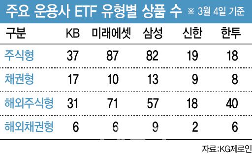 5일 펀드평가사 KG제로인이 분류한 국내 주요 운용사 유형별 ETF 수에 따르면 해외 주식형 ETF 수가 가장 많은 곳은 미래에셋자산운용으로 총 71개의 ‘해외 주식형’ ETF를 운용하고 있다. 삼성자산운용은 57개, 한국투자신탁운용은 40개, KB자산운용은 31개, 신한자산운용은 18개 순이다.