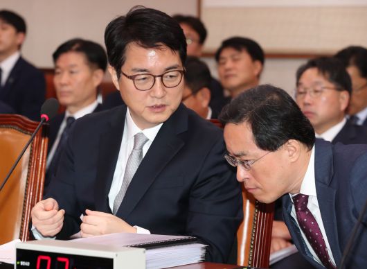 심우정(왼쪽) 검찰총장이 지난해 10월 21일 오전 서울 여의도 국회에서 열린 법제사법위원회 대검찰청 국정감사에서 이진동 차장검사와 대화를 나누고 있다. /이덕훈 기자 |