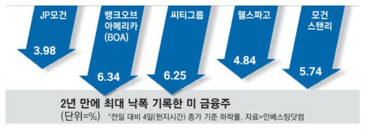 4일(현지시간) 미국 뉴욕증권거래소에 따르면 미국의 최대 종합 금융 기업 JP모건체이스는 전 거래일 대비 3.98% 하락한 250.25달러에 장을 마감했다. 이날 미국 증시에서는 금융주 위주로 하락세가 이어졌다. 뱅크오브아메리카가 6.34%, 씨티그룹이 6.25% 하락하며 거래를 마무리했고 웰스파고와 모건스탠리도 각각 4.84%, 5.74% 떨어지는 등 주요 금융 종목의 주가가 내렸다.