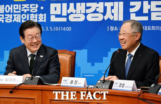 [더팩트ㅣ국회=서다빈 기자] 더불어민주당과 한국경제인연합(한경협)이 10년 만에 만났다. 류진 한경협 회장은 이재명 민주당 대표에게 상법개정안 검토를 요청했으나 이 대표는 시장 불안 해소가 우선이라며 사실상 거절 의사를 밝혔다.