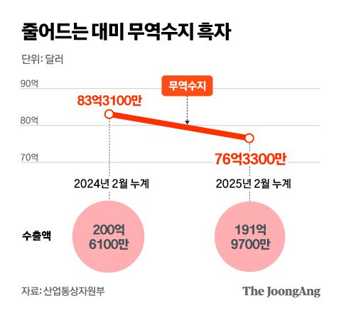 정부는 일단 대미 흑자를 줄이고, 한국이 미 제조업 부흥에 기여하고 있다는 점을 강조하면서 물밑 협상을 이어가고 있다. 실제 지난 1~2월 누적 대미 무역수지는 76억3300만 달러 흑자로 전년동기 대비 8%가량(6억7700만 달러, 1조원가량) 줄었다. 1월과 2월 모두 전년 대비 ‘마이너스’였다. 수출이 일반기계와 자동차를 중심으로 감소한 영향이 컸다. 앞으로 미국 현지 생산을 늘리고, 미국으로부터 에너지ㆍ농산물 등의 수입을 확대하면 대미 무역흑자는 앞으로도 감소 흐름을 이어갈 가능성이 크다.