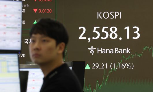 5일 서울 중구 하나은행 본점 딜링룸 현황판에 코스피 지수가 표시돼 있다. 이날 코스피 지수는 전 거래일보다 29.21포인트(1.16%) 오른 2558.13으로 마감했다. 연합뉴스 |