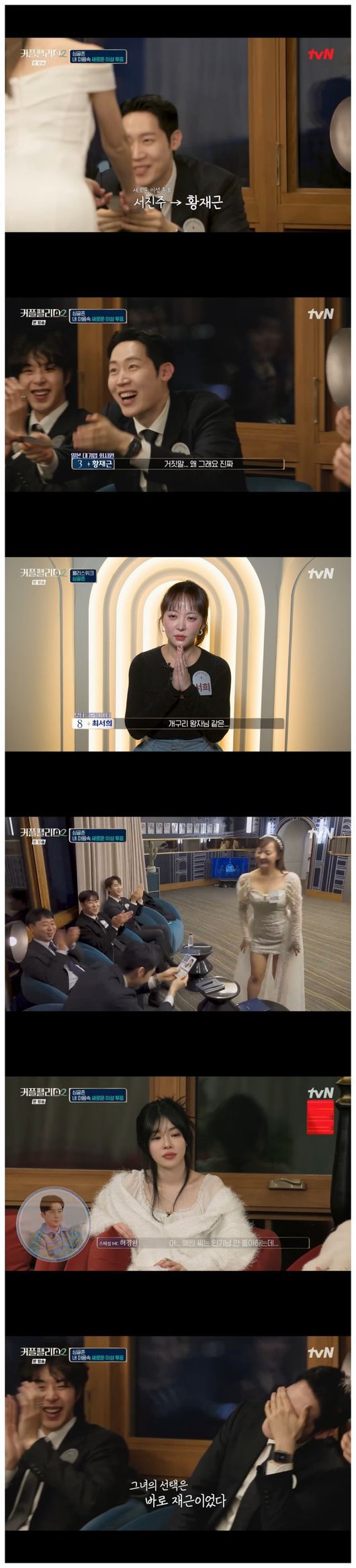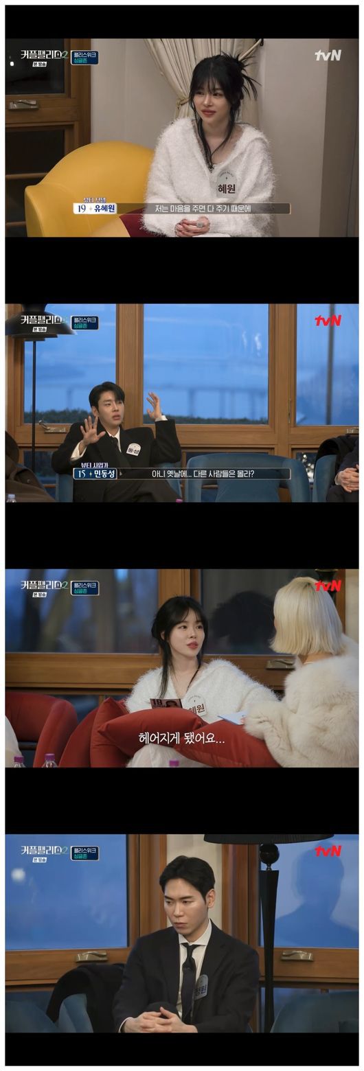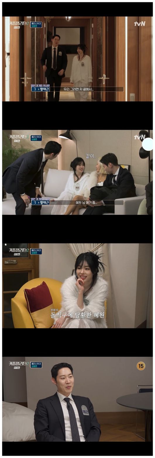 그러나 유혜원의 속내를 모르는 황재근은 혼돈스러웠다. 이정원은 “왜 황재근을 거절했냐”라며 유혜원에게 단도직입적으로 물었다. 유혜원은 “사실 커플 매칭을 천번 만번을 고민했다. 사연이 있다”라며 “뭔가 이 마음으로 가면 민폐 끼치려나? 용기가 없었다”라면서 솔직히 말했다.