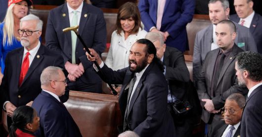 그러자 민주당 의원들은 야유를 보냈다. 앨 그린 민주당 하원의원은 벌떡 일어나 “당신은 자격이 없다(No mandate)”고 외치며 대통령을 향해 지팡이를 겨눴다. 공화당 의원들은 “USA(미국)”를 연호하며 맞섰고 그린 의원 또한 대통령 비판을 멈추지 않았다. 그는 결국 의회 경호원에게 끌려 나갔다.