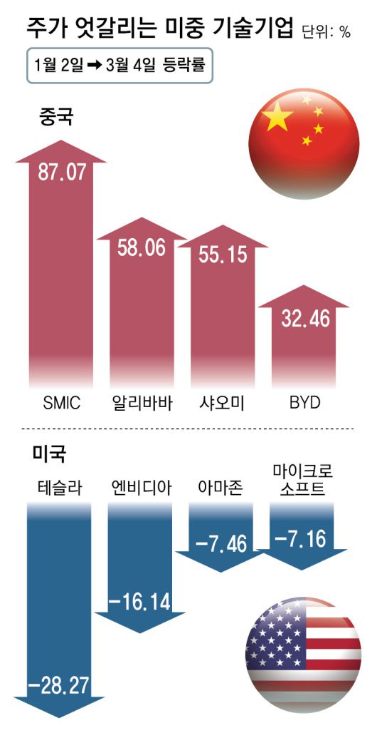 중국을 견제하기 위한 ‘아메리카 퍼스트’ 정책이 오히려 미국 기업 몸값을 떨어뜨린 셈이다. 테슬라, 엔비디아, 애플 등의 중국 매출 하락에 대한 우려가 반영됐다. 반면 중국 테크 기업들은 주로 자국 내수 시장을 바탕으로 하는 데다 시진핑 정부의 적극적인 테크 기업 지원, 인공지능(AI) 스타트업 딥시크 열풍 덕을 본 것으로 풀이된다.