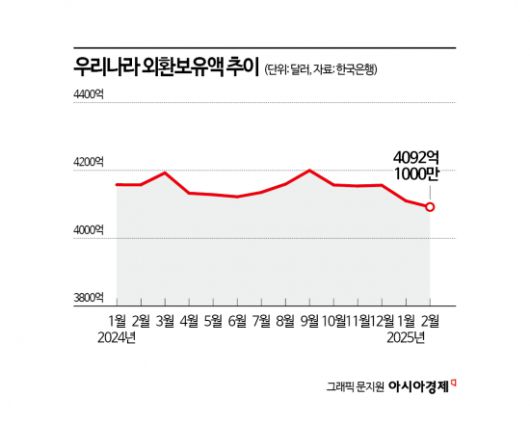 우리나라 외환보유액은 2021년 하반기까지 꾸준히 증가했다. 2021년 10월 말 4692억달러를 기록한 외환보유액은 2022년부터 본격화한 미국 연방준비제도(Fed)의 정책금리 인상 등에 영향을 받으며 규모를 줄였다. 지난해엔 월말 기준 4122억~4199억달러에 머물렀다. 지난해 10월과 11월엔 2개월 연속 감소했다. 트럼프발 미국 통상 정책 불확실성에 달러가 강세를 보이는 상황에서 환율 변동성이 커지자 외환 당국이 환율 방어를 위해 달러 매도에 나선 영향이다. 지난해 12월엔 분기 말 외국환 은행들이 국제결제은행(BIS) 비율을 맞추기 위해 한은에 달러를 집중적으로 예치하면서 외환보유액이 증가 전환했으나 올해 들어 두 달째 감소세를 보이면서 4090억달러 선으로 내려앉았다.