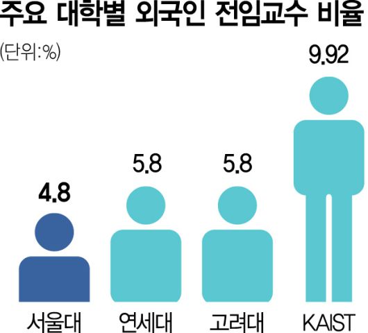 심지어 국내 유수 대학과 비교해도 낮은 수준이다. KAIST는 전체 교수 716명 중 외국인이 71명(9.92%), 연세대는 교수 2188명 중 127명(5.8%), 고려대는 교수 1784명 중 103명(5.8%)이 외국인이었다. 서울대 교수회는 “서울대는 낮은 외국인 교수 비율로 교육과 연구의 국제화에 어려움을 겪고 있다”고 지적했다.