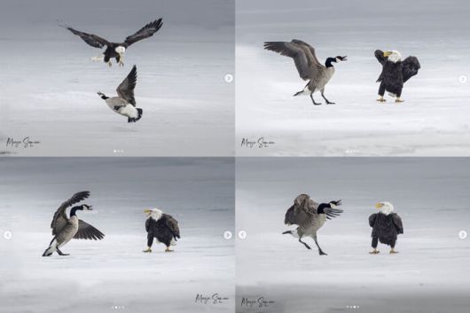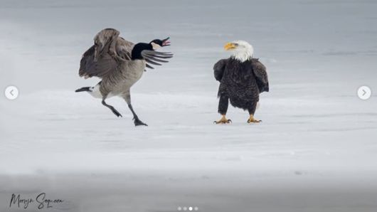 영국 일간 가디언은 5일(현지시간) 캐나다 온타리오주 사진작가 머빈 세케이라가 캐나다기러기와 흰머리독수리가 빙판 위에서 20여 분간 충돌하는 장면을 포착해 사진에 담았다고 보도했습니다.